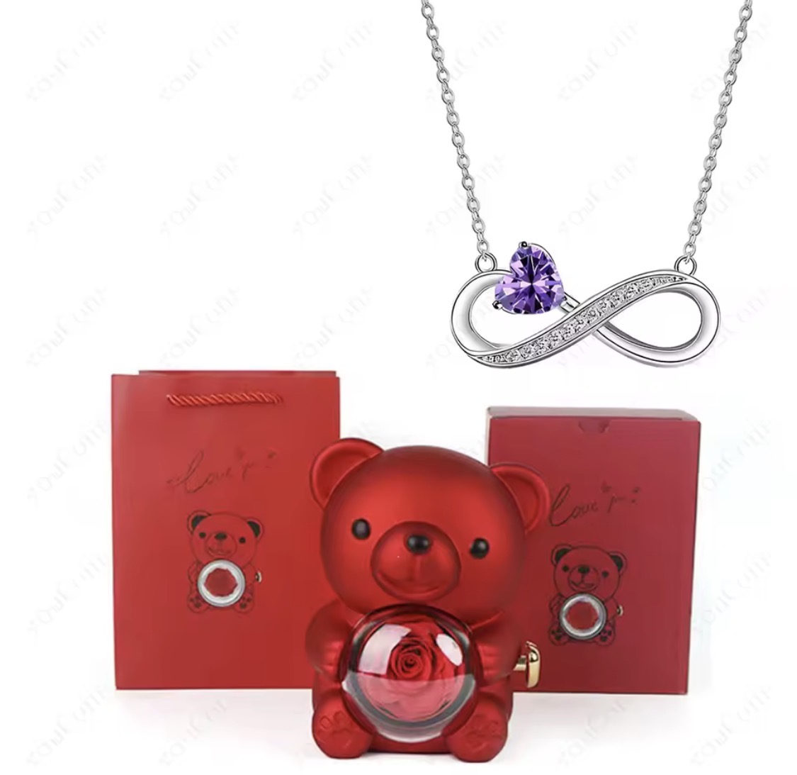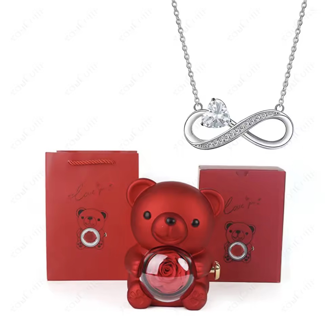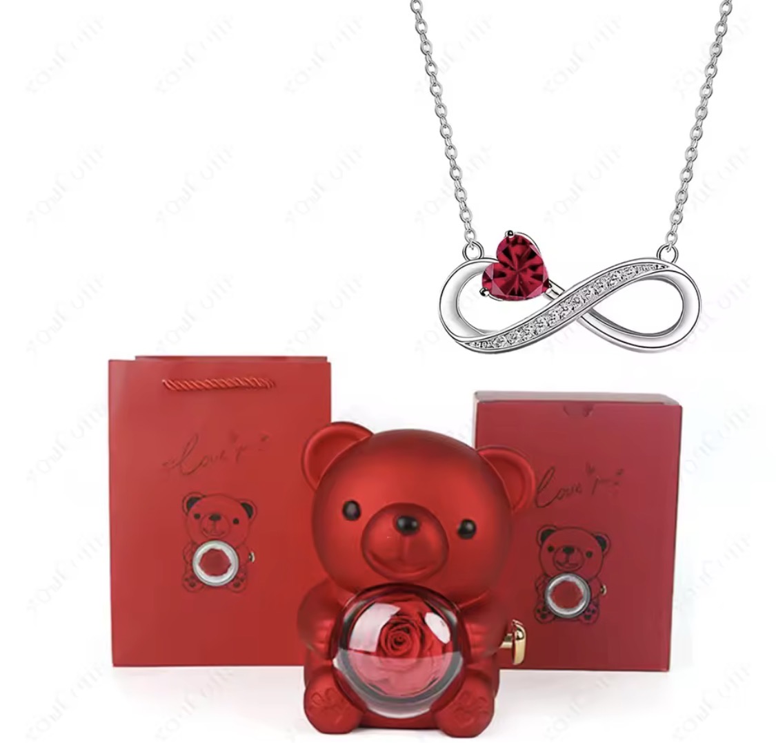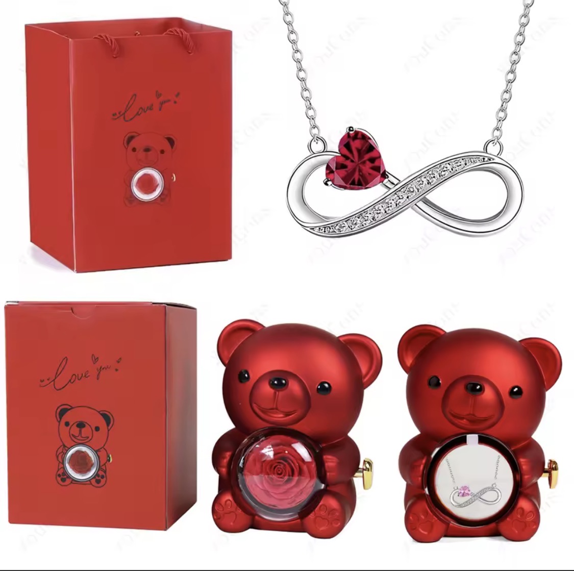 Red Heart Pendant Necklaces With Cute Bear Rose Flower Gift Box
